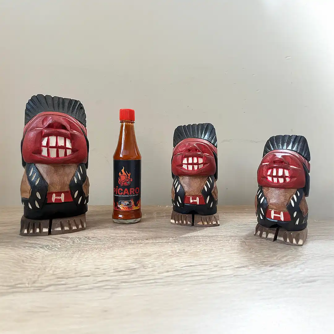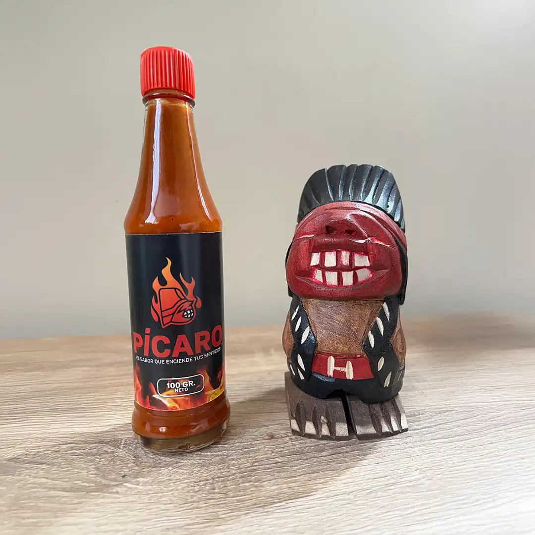 Este pack une dos íconos profundamente chilenos: la salsa de ají Pícaro, elaborada artesanalmente en Temuco con ají cacho de cabra seco y ahumado, y el indio pícaro original, tallado a mano por un artesano de Villarrica, heredero de la tradición creada en la década de 1980 por Jorge Medina Ramírez en Pucón — el creador del auténtico indio pícaro chileno.