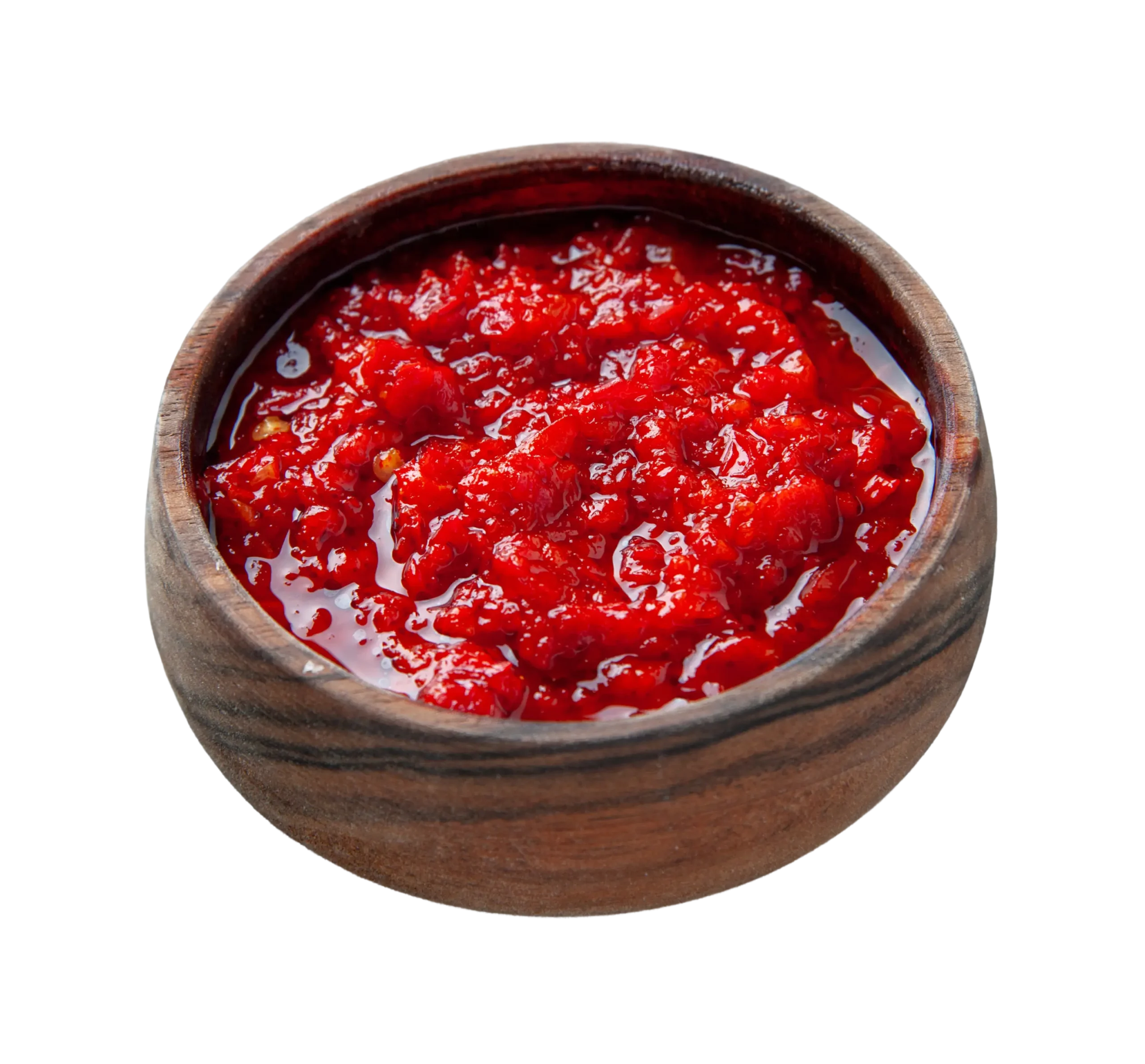 Salsa de color rojo intenso, de picor medio con notas de ajo, olor ahumado intenso y espesor medio.